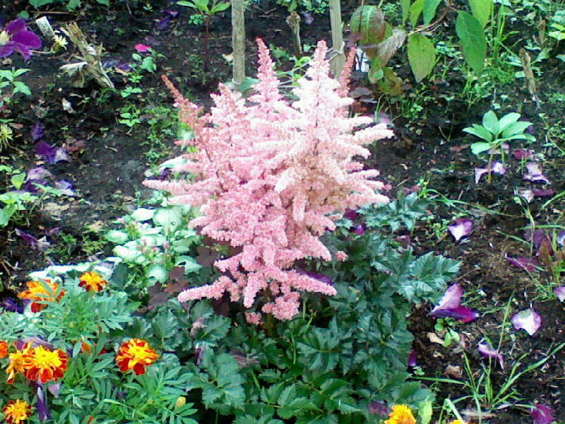 Lollypop- высота 45 см, пышные кремово-розовые соцветия с серебристым блеском. Красные стебли, глянцевая зеленая листва.