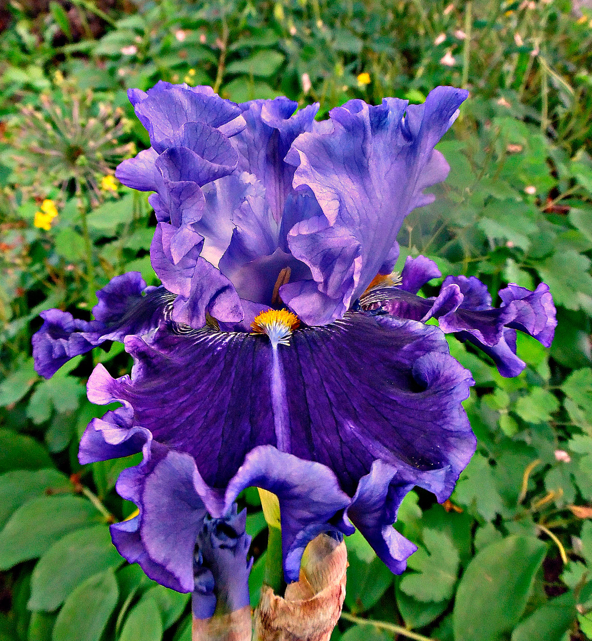 Фолы – парящие сине-вишнёво-фиолетовые, с гофрированной каймой цвета стандартов, от бородки вниз – длинный луч цвета стандартов.
