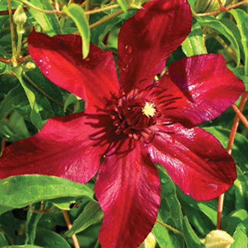 Красивый сорт с очень крупными цветами для любителей красноцветковых клематисов.