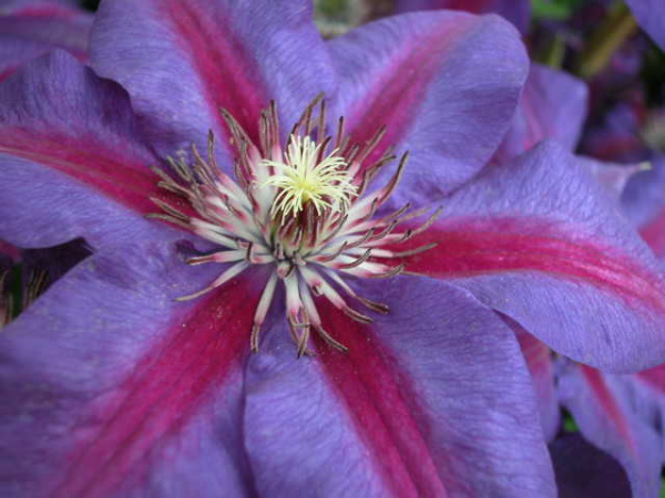 Яркие двуцветные цветки имеют голубые лепестки с бархатисто-красной полоской посередине и красные тычинки.