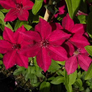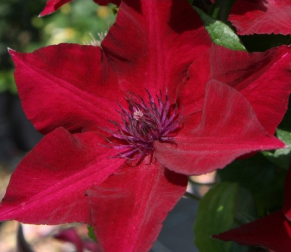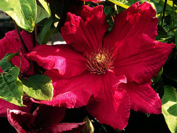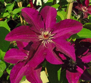 Цветки среднего размера, диаметром 8–12 см, с 6 красно-пурпурными, остро заострёнными чашелистиками и с красными тычинками. Цветёт VI–VIII.