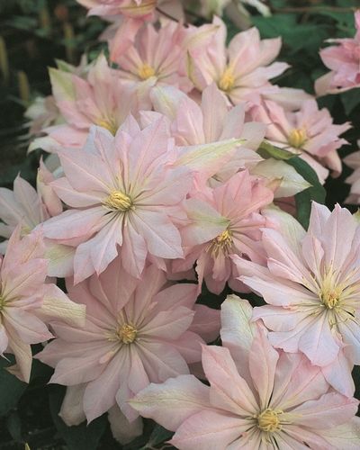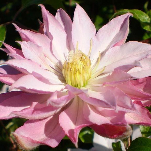Цветки светло-розовые c лавандовыми тенями, полумахровые на прошлогодних побегах в мае, одиночные – на побегах этого года, летом. Тычинки светло-жёлтые. Умереннорастущий. Цепляется за опоры листовыми черешками. Подходит для посадки у небольших садовых опор, решёток. Особенно хорош для использования в хорошо освещенных местах, на небольших участках и садах.