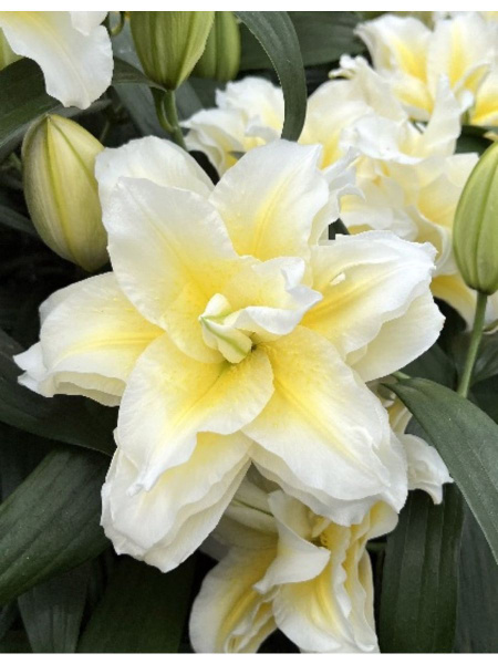 Эта представительница махровых восточный лилий отличается красивыми крупными цветками белого цвета с желтым центром и насыщенным ароматом.