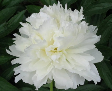 Полумахровый — махровый шаровидный. Цветок 13х10 см, белый с лёгкой желтизной.