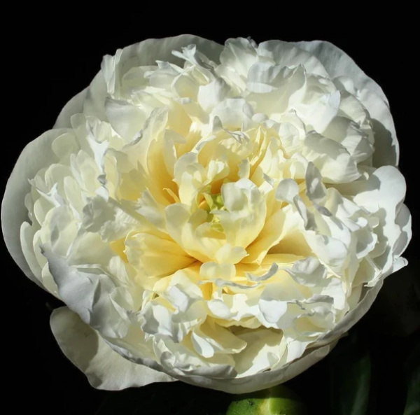 Цветок: махровый, корончатый, плотный, крупный: диаметром 16-18 см, белый с легким кремовым оттенком в начале цветения, затем выгорает до кипельно-белого.