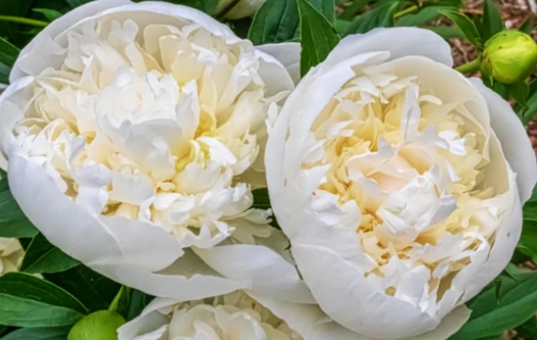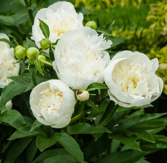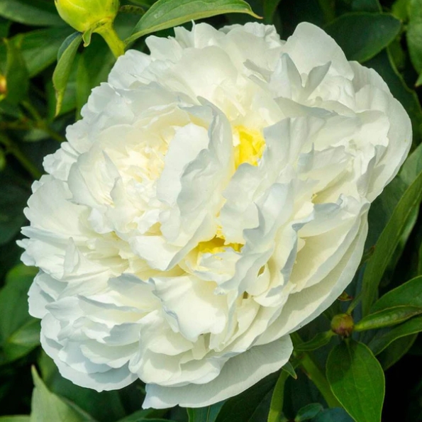 Цветок: махровый, корончатый, плотный, крупный: диаметром 16-18 см, белый с легким кремовым оттенком в начале цветения, затем выгорает до кипельно-белого.