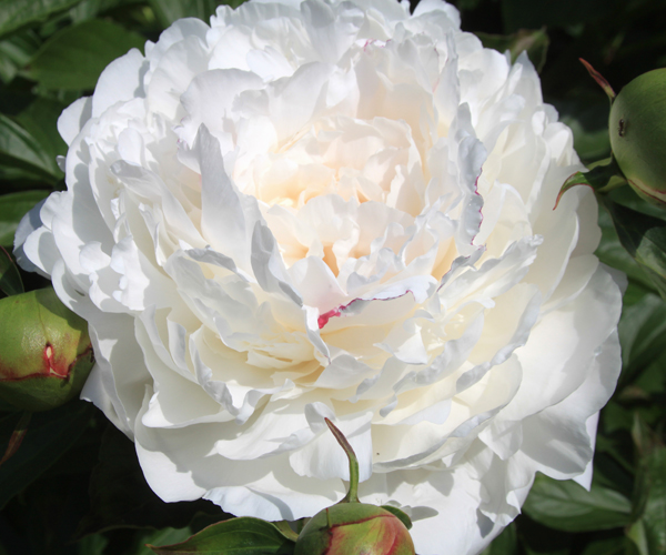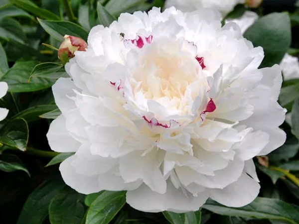 Цветок: густомахровый, плотный, крупный, диаметром 20 см, чисто-белый, центральные лепестки — с оттенками красного цвета.