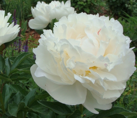 Цветок: махровый, полушаровидный, очень крупный, диаметром 22 см, в начале цветения имеющий розоватый оттенок, позднее белый.
