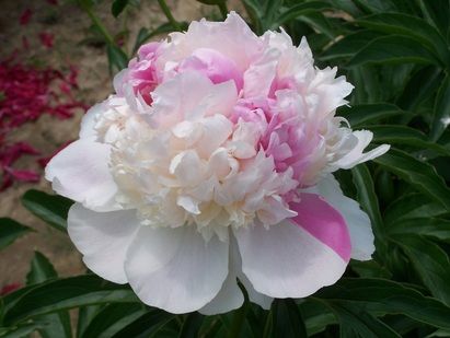 Махровый полушаровидный. Цветок розовато-кремовый, иногда белый с розовыми пятнами, диаметром 16 см, с высоким центром.