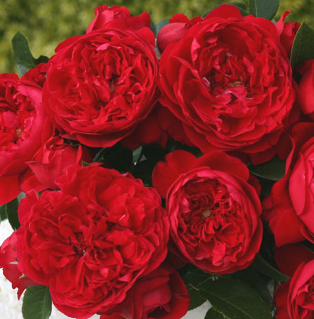Ярко-красные цветки с желтым глазком (8-10см), розетковидной формы, густомахровые (26-40 лепестков), обладают легким фруктово-цветочным ароматом.