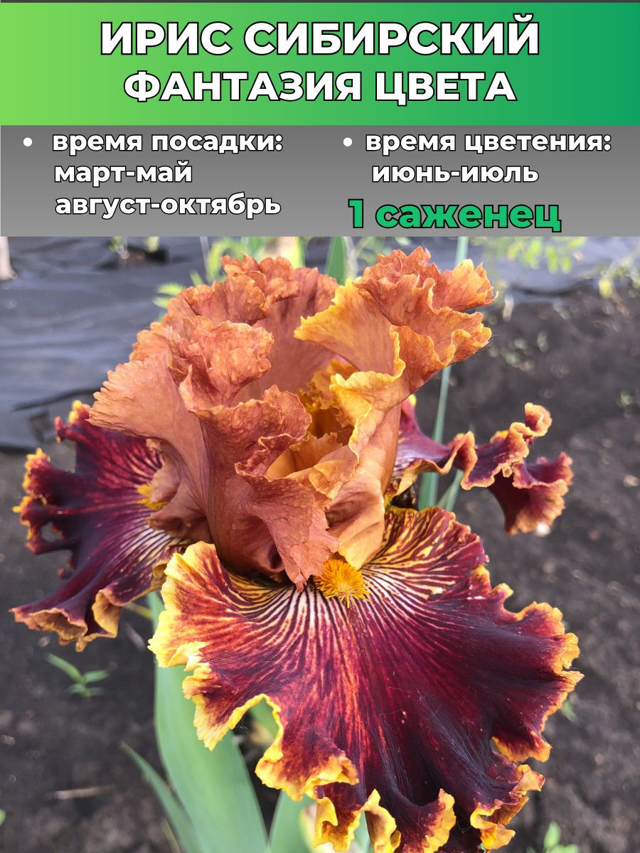 Стандарты — горчичные с вишневым напылением. Фолы — беспорядочные брызги вишневого, желтого и коричневого с желто-горчичной каймой. Бородки — горчичные. Гофрированный, парящий, крупный, каждый цветок неповторим.
