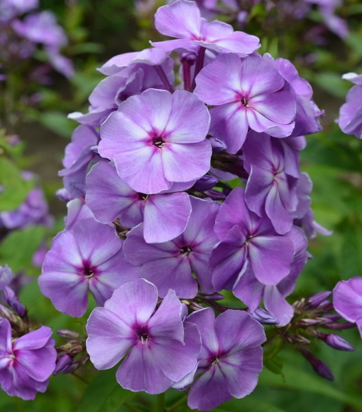 Светло-фиолетовый с белым лучистым центром и размытым пурпурным глазком.