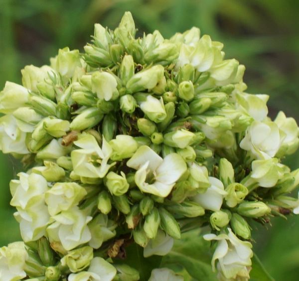 Цветки кремово-белые с жёлто-лаймовым оттенком, открываются не полностью, отчего кажутся махровыми.