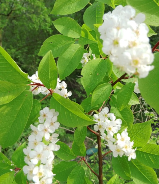 Цветет в апреле-мае, белыми, душистыми цветками в плотных, поникающих кистях длиной 10-15 см.