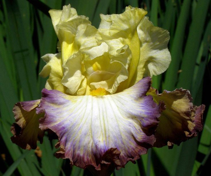 Жёлтые стандарты и белые фолы. С пурпурной широкой каймой и винно-красной окантовкой по краям. Отличная форма цветка