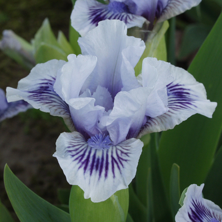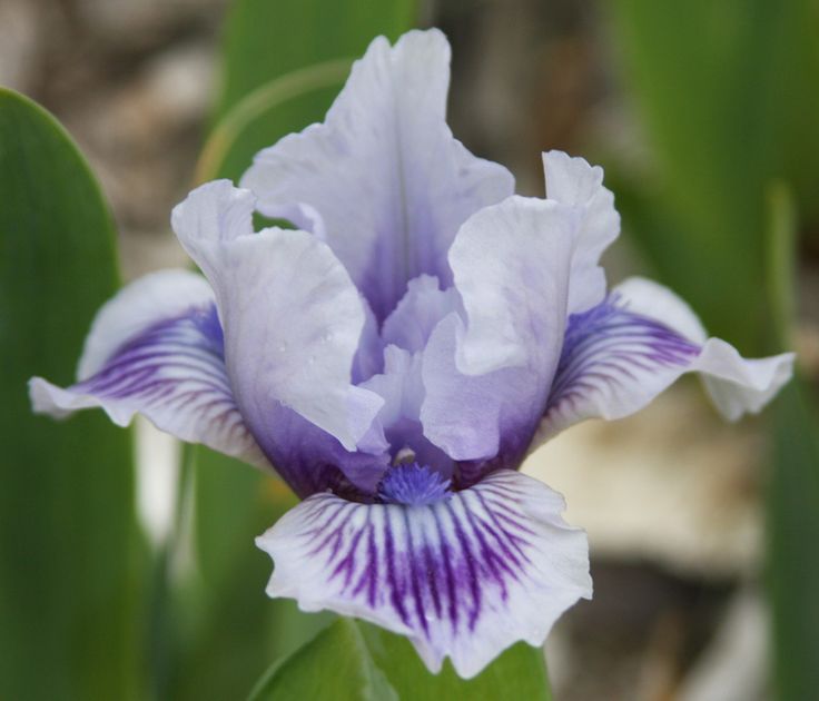 Палево-голубой с пурпурными прожилками на фолах и насыщенной синей бородкой.