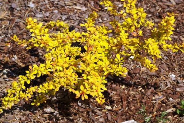 Листья округлые, мелкие, с меняющейся окраской: весной нежно-розовые с красной каймой, летом имеют ярко желтую окраску, осенью становятся оранжевыми.