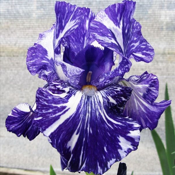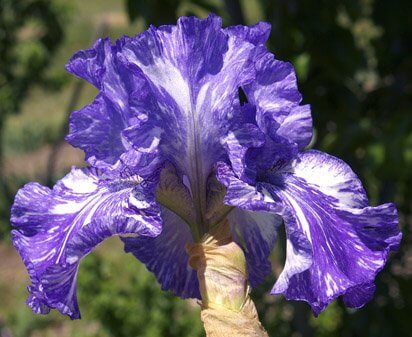Virginia Messick. США. 1998 Большой, сине-голубой цветок, с белыми полосками, пятнами и брызгами. Бородка — жёлто-коричневая, кончик голубой. Высота 91 см.