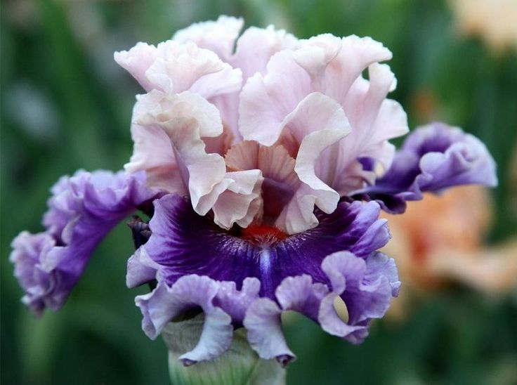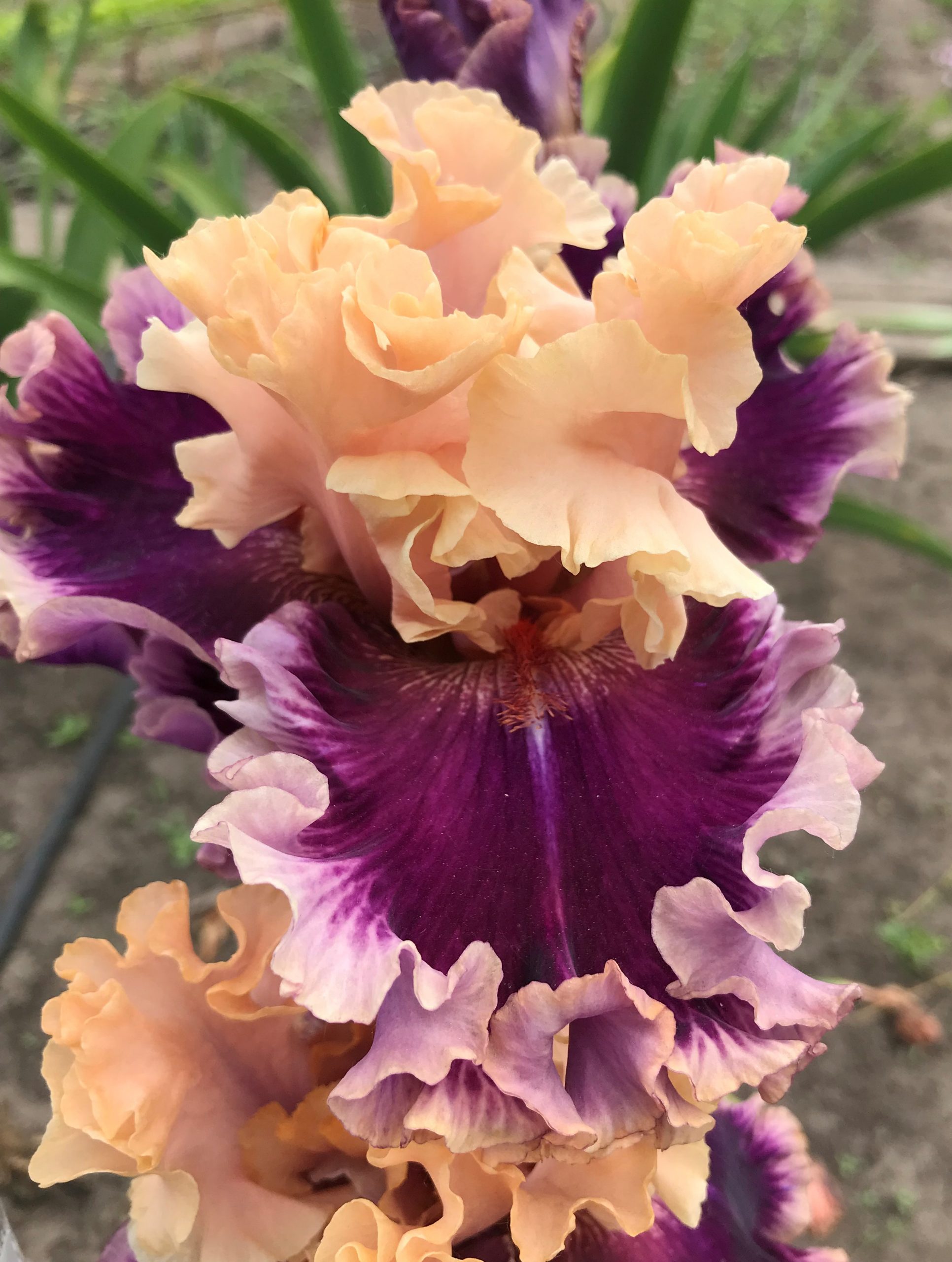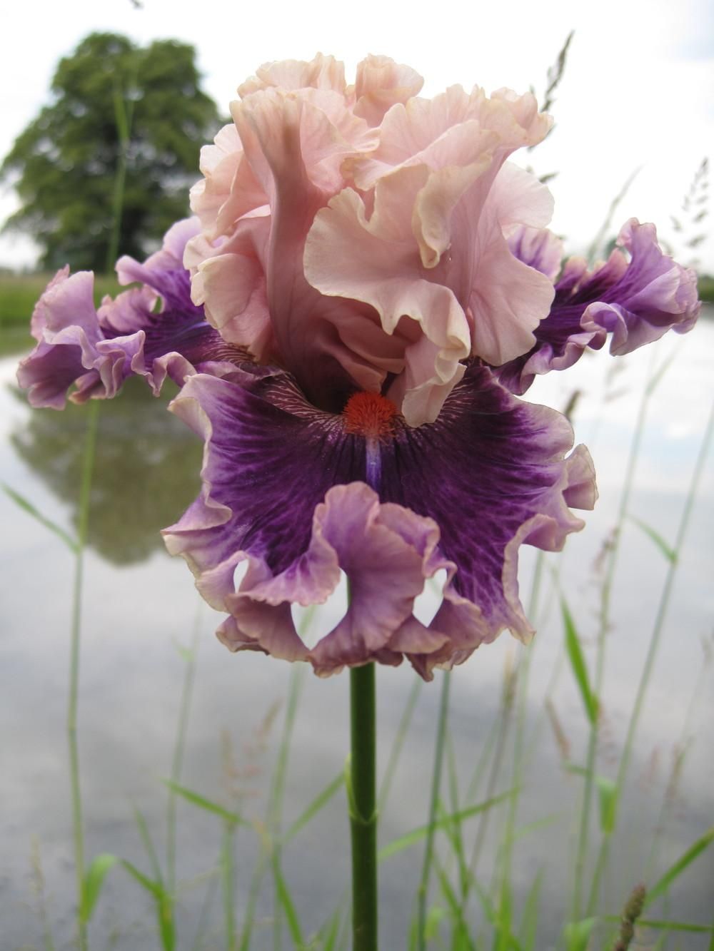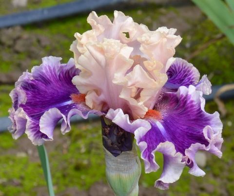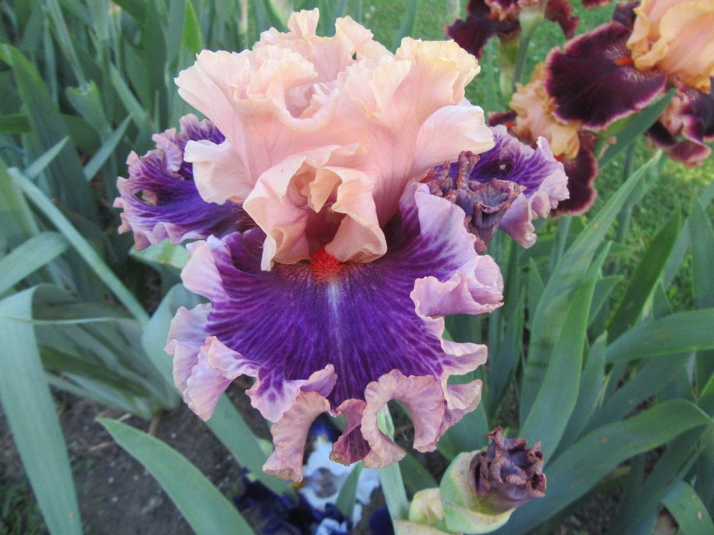 Cстандарты – нежно-розовые со сливочно-кремовой каймой. Фолы – тёмно-розово-фуксиновые с голубовато-светло-сиреневой каймой. Бородки – кирпично-красные, под ними небольшой синий мазок. Очень гофрированный.