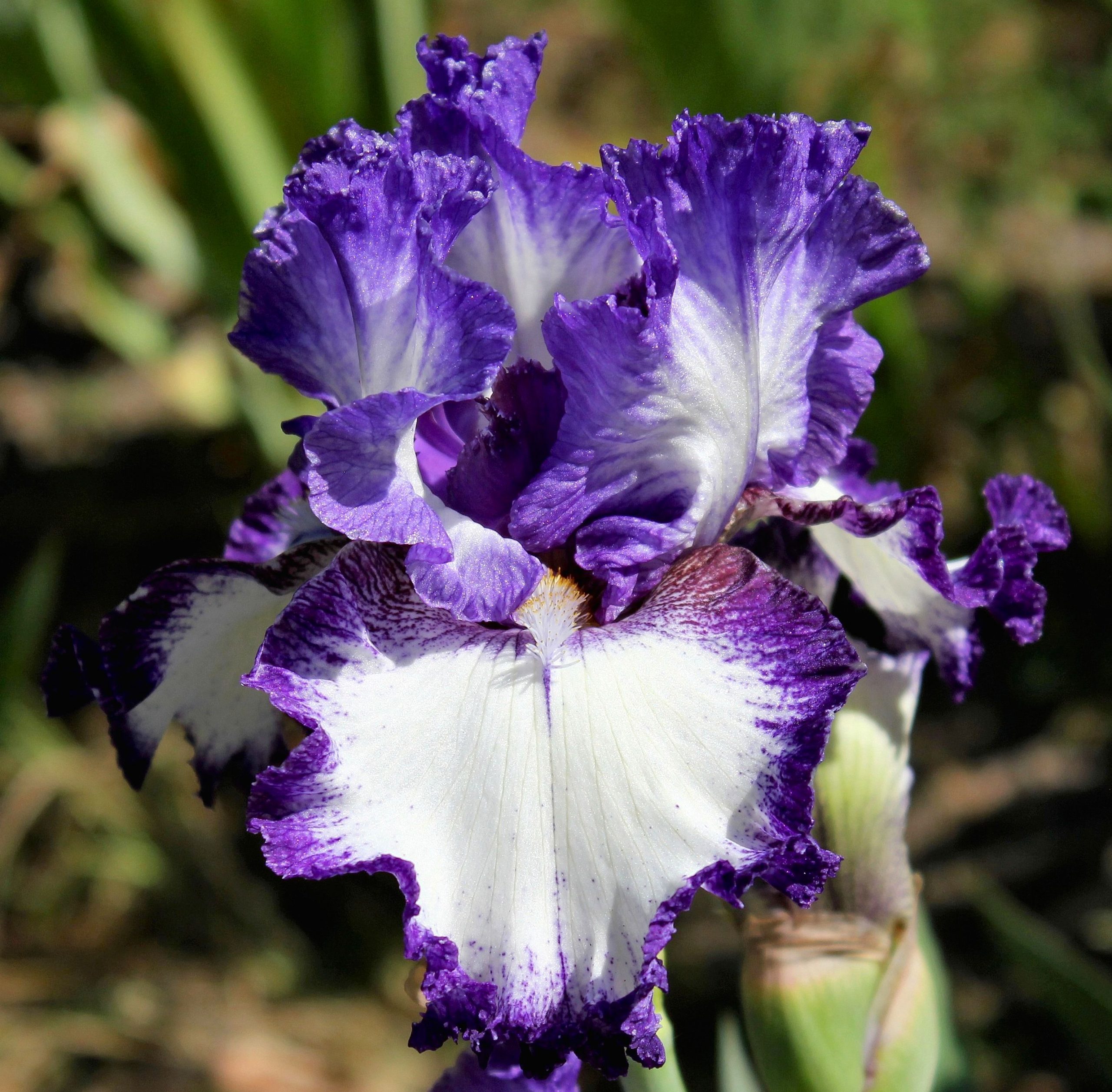 Стандарты (верхние лепестки) белые с размытым широким кантом, крапом и центральными жилками василькового цвета; на фолах (нижних лепестках) присутствует пликата (образец окраски с антоциановым узором на светлом поле) – сине-фиолетовая кайма и крап на белом фоне; основания фолов украшены красноватым напылением; бородки золотисто-желтые