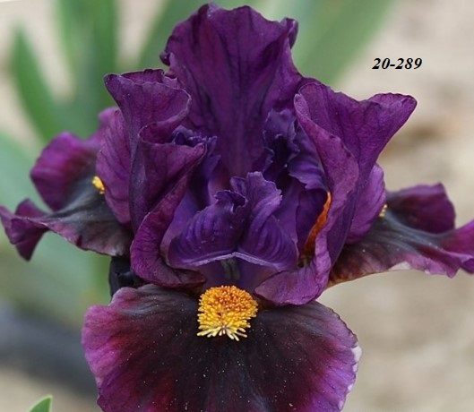 Поздний ирис с винно-пурпурными стандартами и еще более темным пятном на фолах, бородка желто-оранжевая.