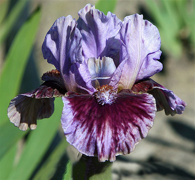 Средне-поздний ирис с окраской «broken color», видимой только на широкой сине-лиловой кайме у фолов за пределами большого бургундского пятна. Бородка светло-синяя с коричневыми кончиками.