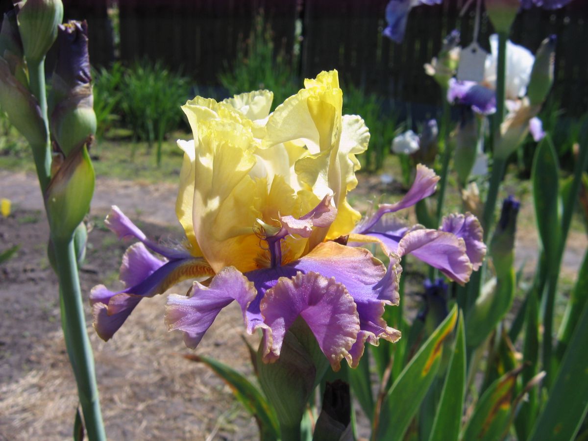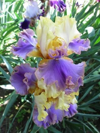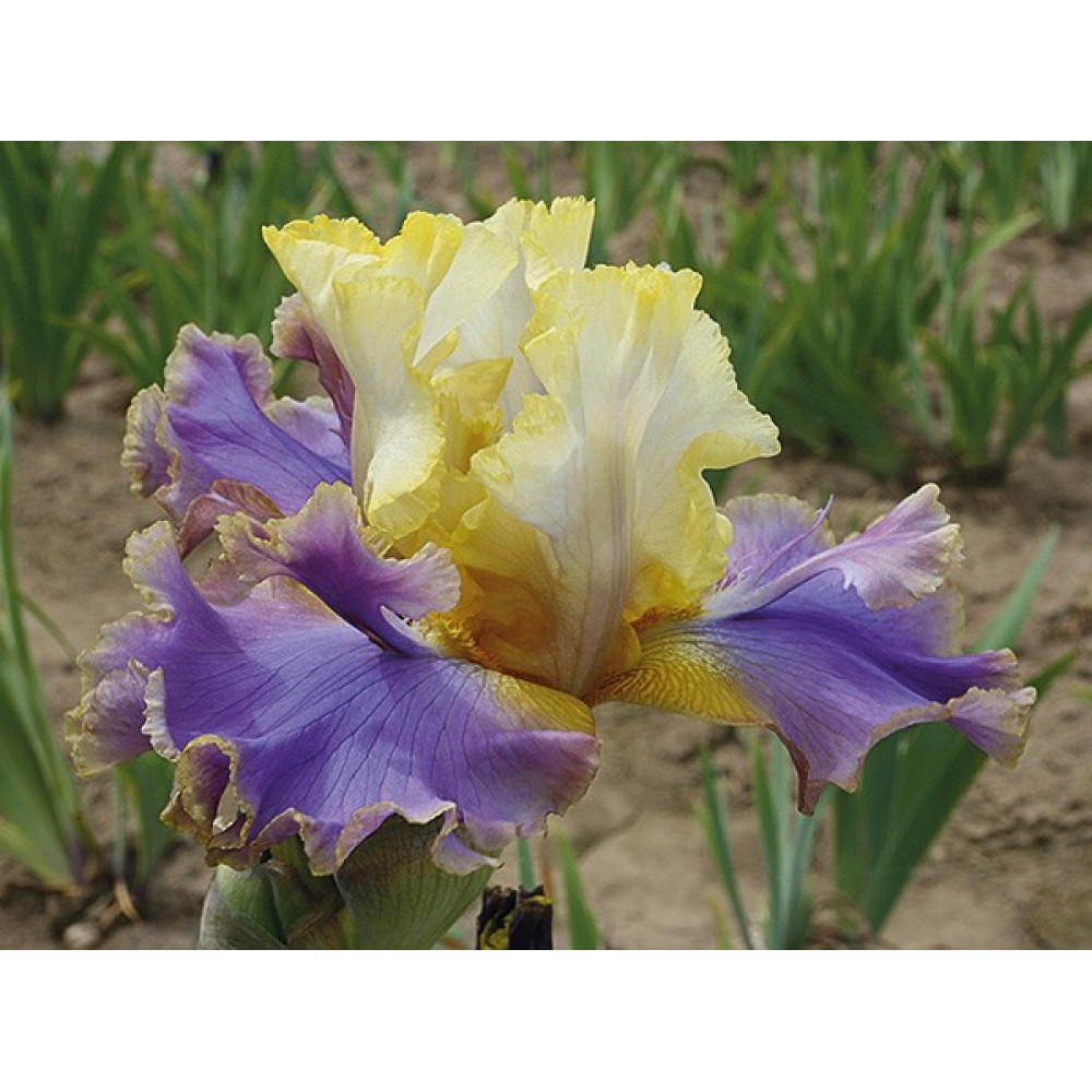Стандарты жемчужные, у основания и по краям золотые. Фолы гофрированные красно-лавандовые с золотыми плечиками. Бородки жёлтые, переходящие на конце в сиреневую ложку. Необычный по окраске сорт.