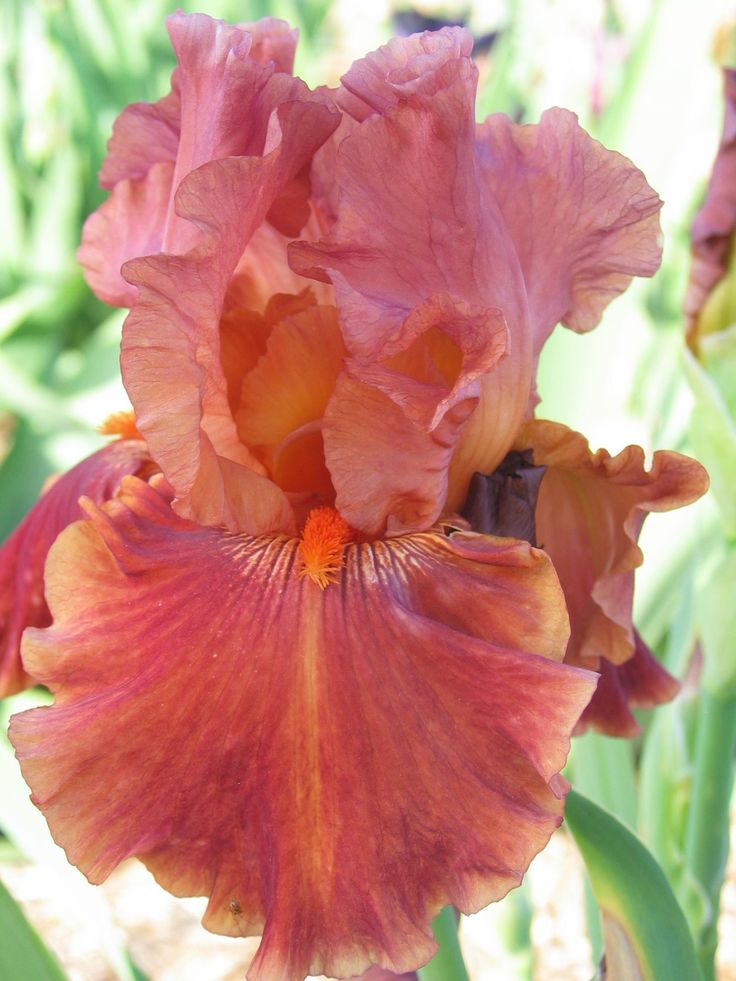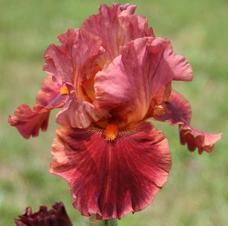 Стандарты розово-терракотовые. Фолы розово-терракотовые, переходящие в розово-бургунди с каймой цвета стандартов. Бородка мандариново-красная. Сильно гофрированный, яркий, привлекает внимание!