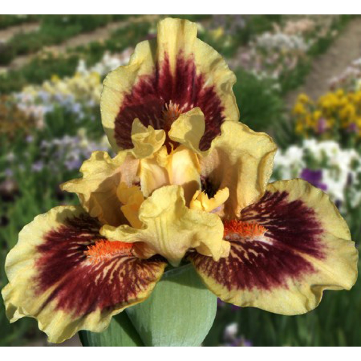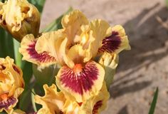 Стандарты карамельно-оранжево-лимонные. Фолы цвета стандартов, испещрены красно-бордовыми и желтыми прожилками в области оранжевой бородки. Гофрированный, парящий. Слабый сладкий аромат. 2-3 цветка выше листьев.