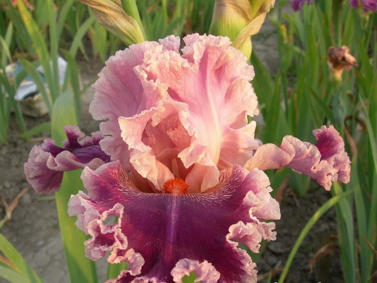 Стандарты сиренево-розовые. Фолы сливово-сиреневые с каймой цвета стандартов, от бородки еле заметная сиреневая продольная полоса. Супер кудрявый сорт!
