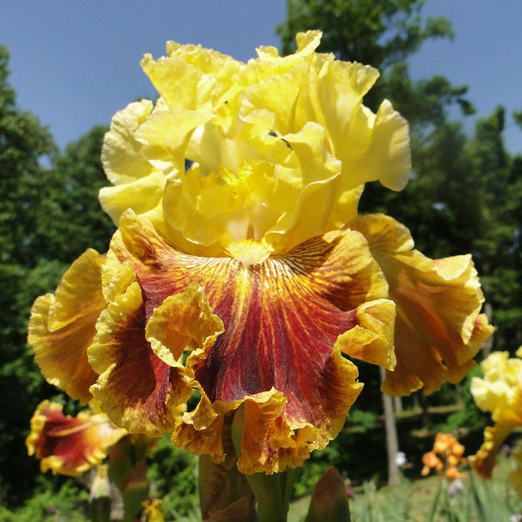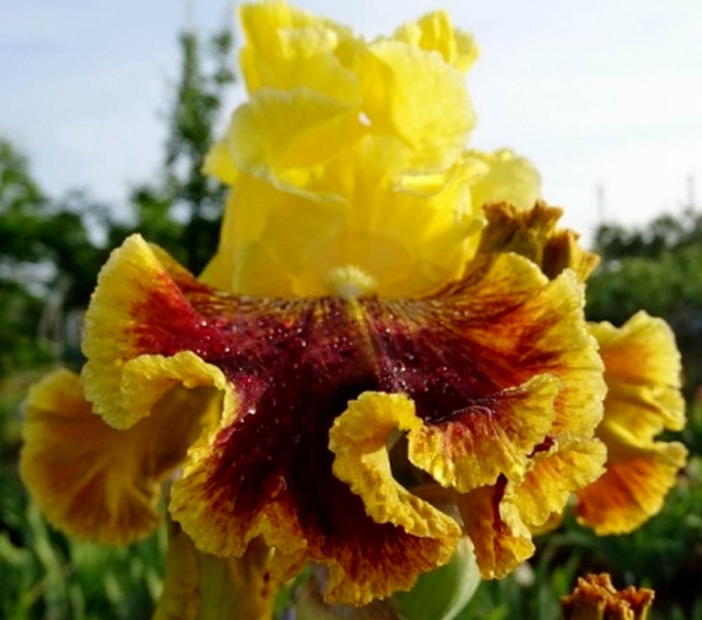 Сильно гофрированный. Стандарты — золотисто-жёлтые. Фолы — красного оттенка с жёлтой каймой. Крупный, яркий!