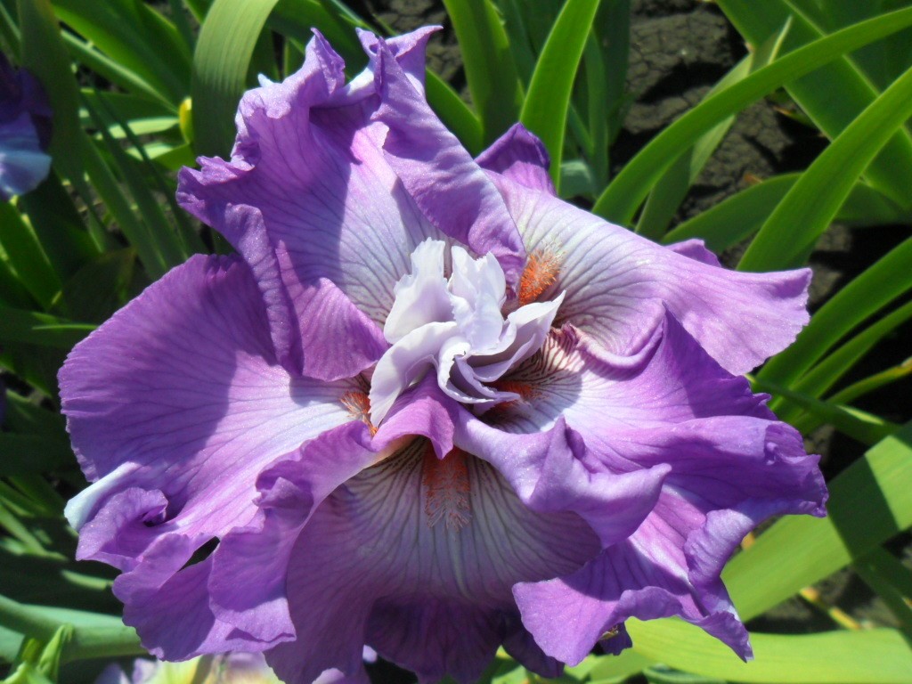 Шестифолый сиреневый цветок, напоминающий японский, бледнеющий к центру и к оранжево-красной бородке.