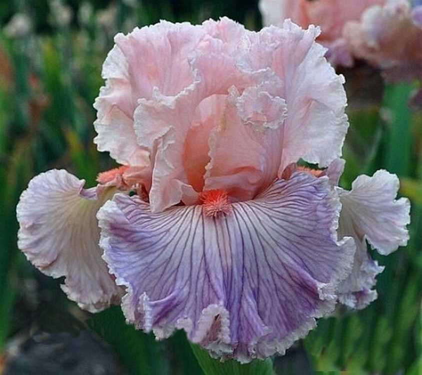 Одноцветный, пастельно-розовый цветок, с выраженными фиолетовыми жилками на фолах. Бородка розово-коралловая, кружевной. Высота 89 см. Позднее цветение.