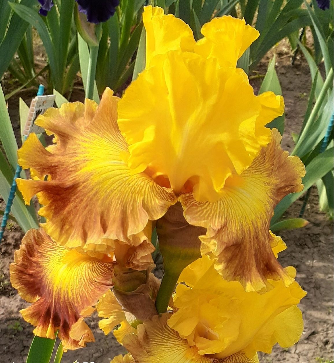 Темно-желтый с широкой коричневой каймой на фолах. Выделяется желтая полоса на краю фолов. Бородка желтая. Гофрированный.