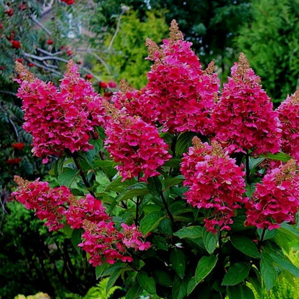 Соцветия крупные, вначале белые, затем быстро меняют окраску на розовую и в конце цветения становятся полностью малиново-красными.