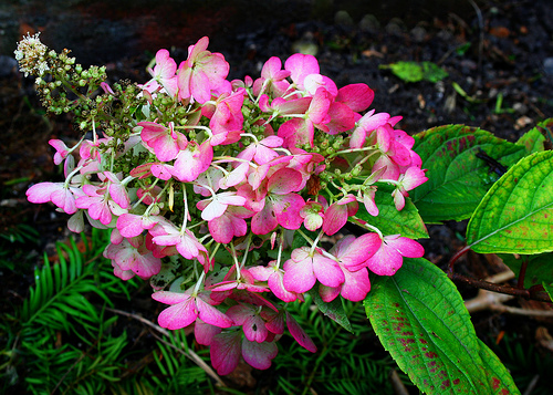 Соцветия длиной до 20-30 см состоят из плодущих и большей части крупных стерильных цветков, по краям слегка волнистых.