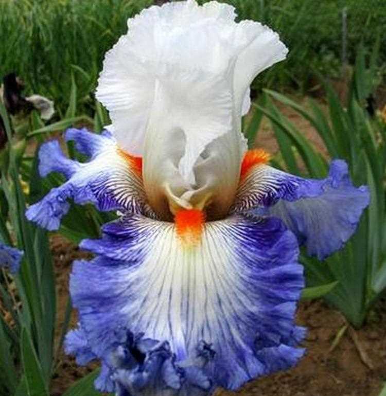 Anton Mego. Словакия. 2016 Стандарты снежно-белые. Фолы белый центр с синими прожилками и густой небесно-синей каймой. Бородка красная, супер-пышная, королевская. Крупно-волнистая гофра. Очень красивый, необыкновенно яркий.