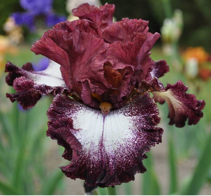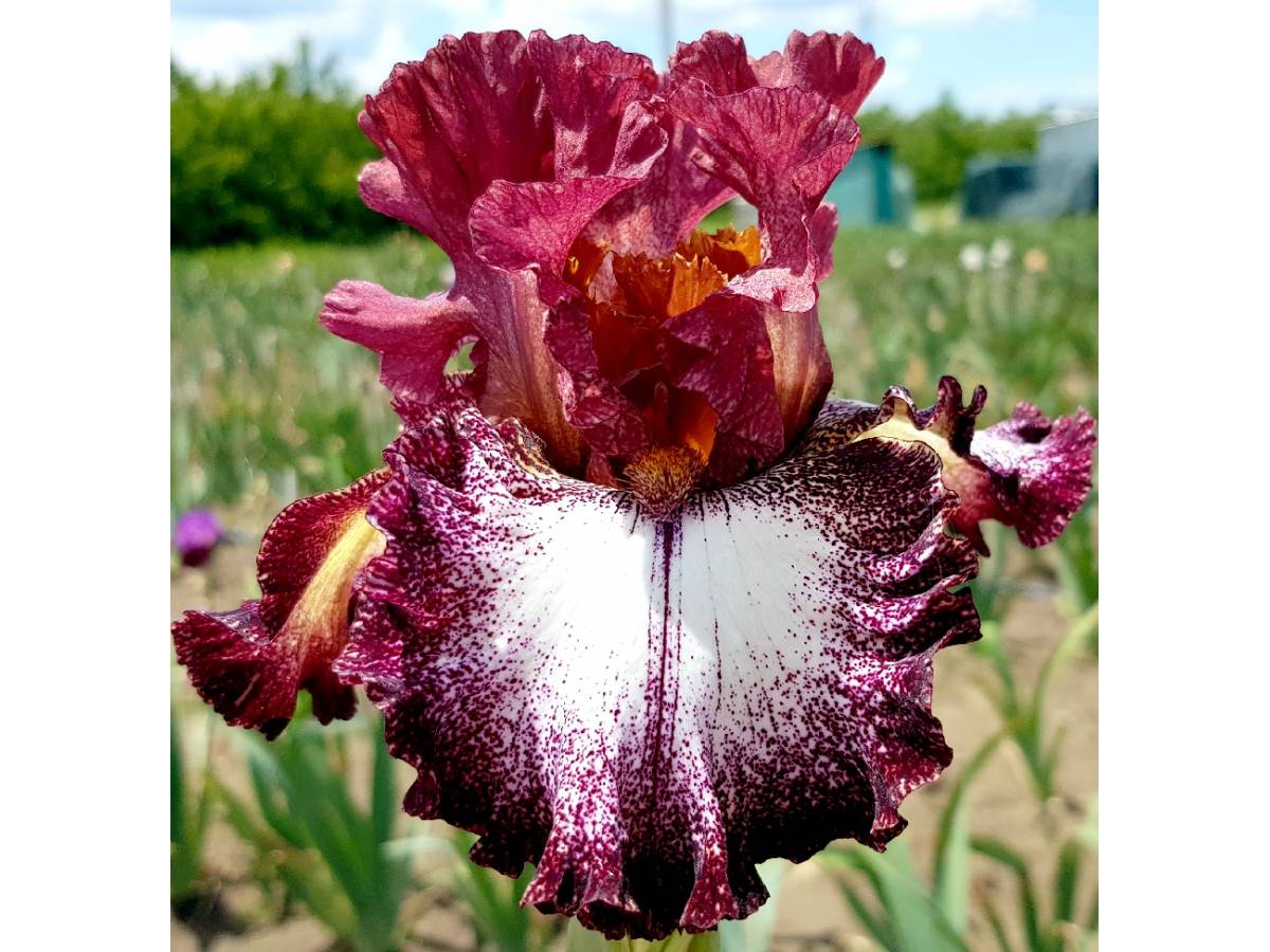Сильно гофрированные, бордово-малиновые стандарты. Фолы белые, с широкой, насыщенной, винной каймой-пликатой и полосой в тон каймы исходящей от бронзовой бородки. Превосходный сорт!