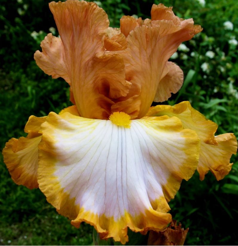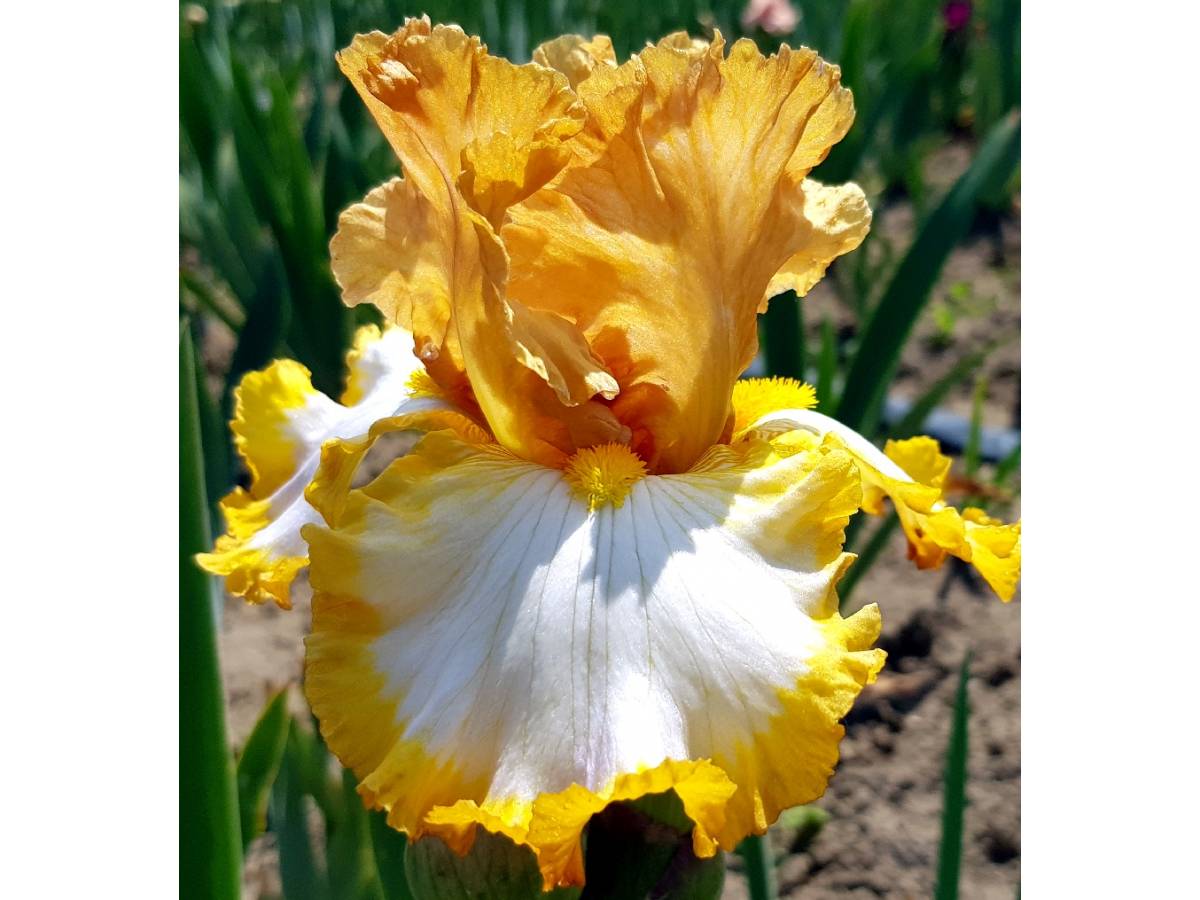 Стандарты светло-орехово-коричневые. Фолы — белые с голубовато-сиреневым налетом и каймой цвета стандартов. Бородка ярко-золотистая.