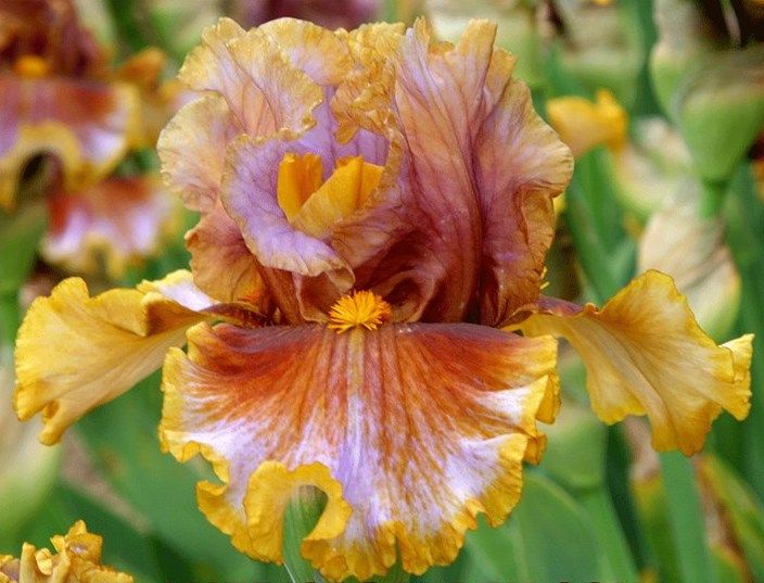Уникальное сочетание цвета и рисунка! Стандарты красно-янтарные с золотистым до светло-сиреневого обрамлены золотой каймой. Фолы цвета стандартов с более четко выраженной и широкой золотой каймой. Хорошее ветвление до 12 бутонов.