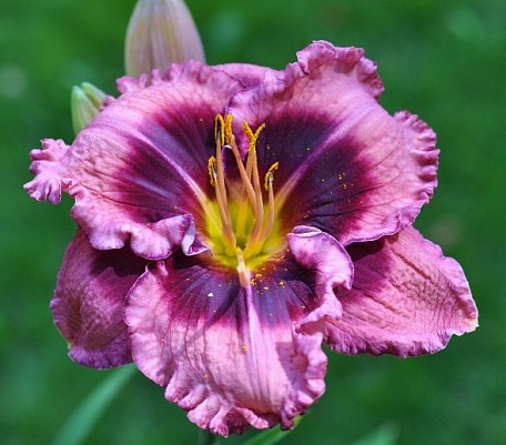 сиренево-лавандовый с фиолетово-пурпурным глазом и узкой каймой такого же пурпурного оттенка на гофрированных лепестках.