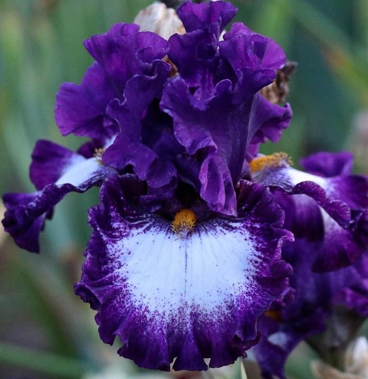 Стандарты – темно-фиолетовые. Фолы – белые с пликатой цвета стандартов с прожилками и точками у основания. Бородки – ярко-золотые. Очень гофрированный и кружевной! Очень эффектный! Великолепная форма!