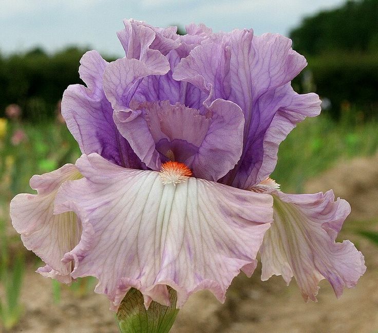 Стандарты сиренево-голубовато-орхидные. Фолы перламутрово-белые, с жемчужным краем. Бородка красно-мандариновая, кончик белый, гофрированные.