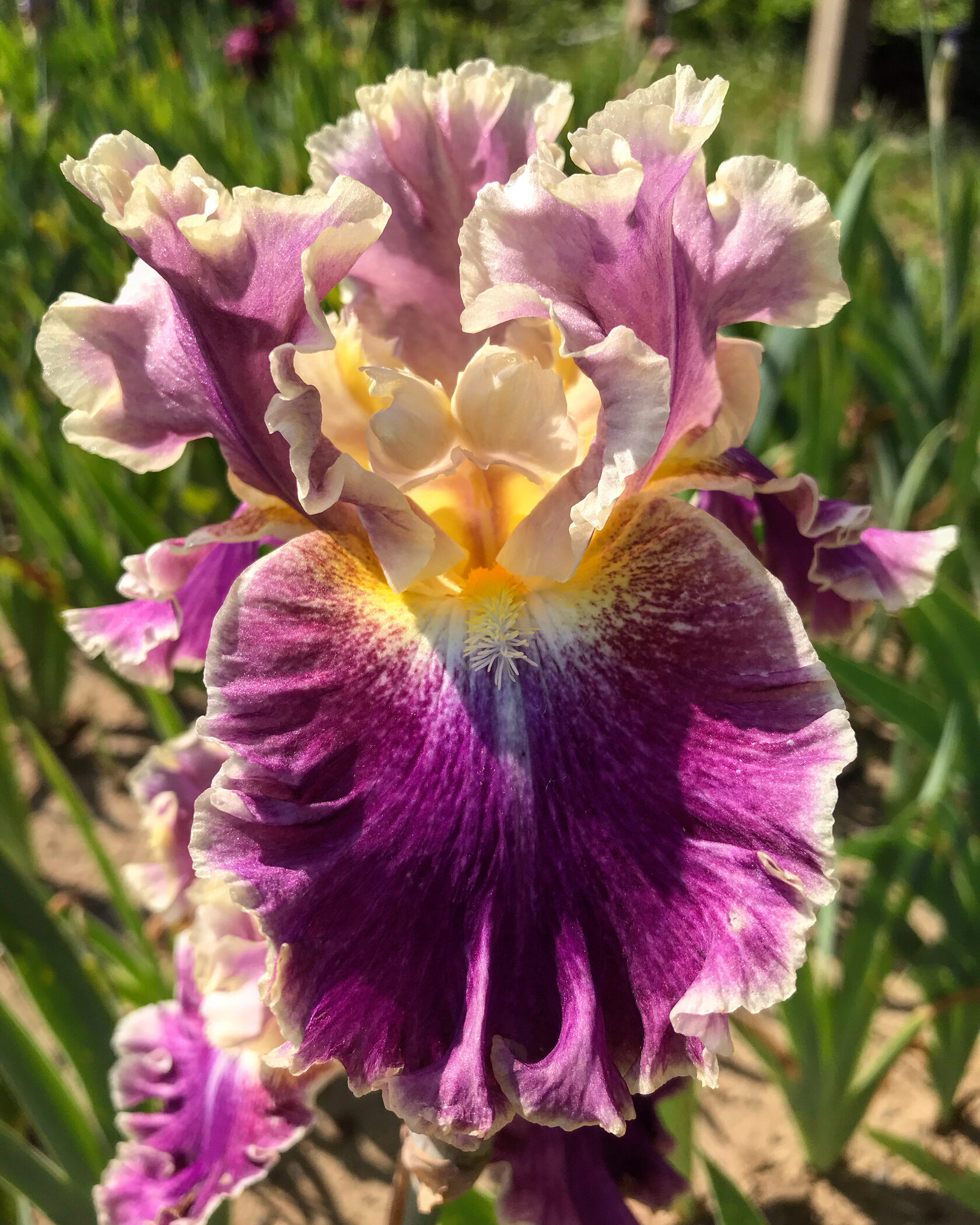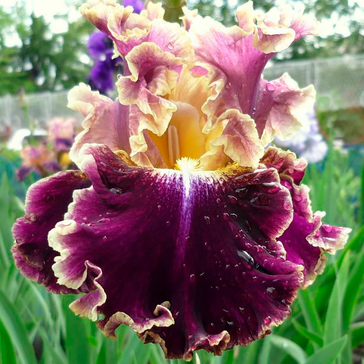Стандарты розово-пурпурные. Фолы темно-красно-пурпурные с небольшой светлой областью у бородки. Тонкой очень кружевной каймой цвета стандартов. Очень приятный.
