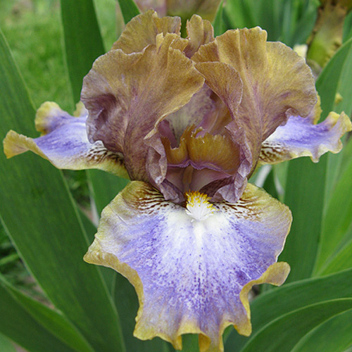 Фолы трехцветные — бежевые плечики переходят в кайму вокруг лавандово-синих лепестков с белям пятном по середине и под бородкой.