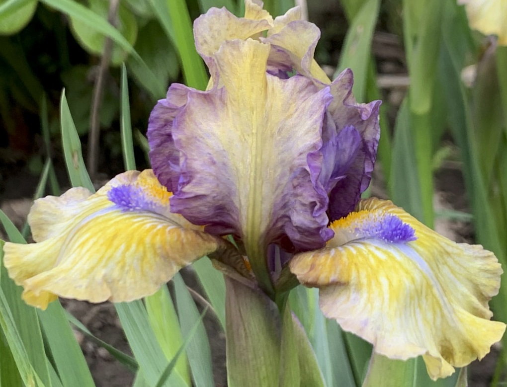 Стандарты жёлтые с сильно гофрированными фиолетовыми краями. Стайлы такие же фиолетовые. Фолы желтые с зеленовато-желтым пятном под бородой. Бороды оранжевые с фиолетовым кончиком.