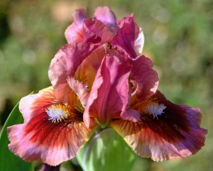 Фолы цвета пурпурной магнолии с кардинально-красным пятном, сгущающимся до почти черного вокруг горчичных с белыми кончиками бородок.