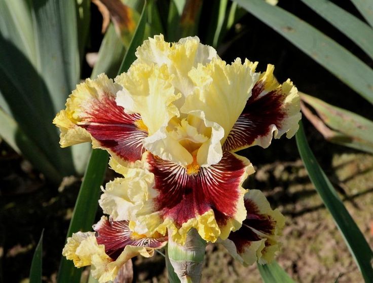 Стандарты лимонно-желтые. Фолы ярко-рубиновые с широкой каймой цвета. Стандарты с очень выразительным белым жилкованием у оранжевой бородки. Прекрасное сочетание цветов не оставляет быть равнодушным к нему.