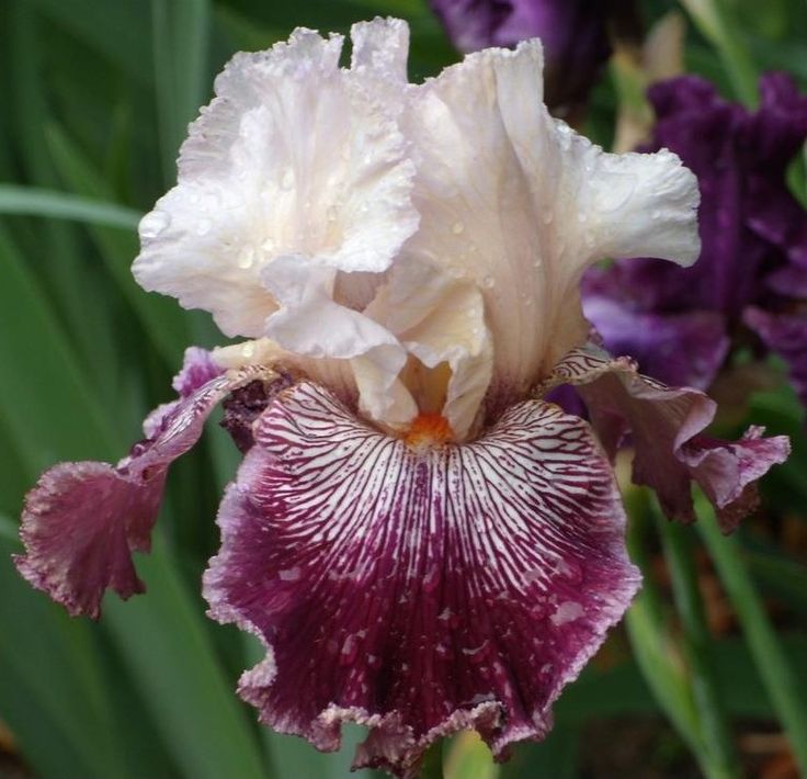 Стандарты — цвета шампанского, по центральной жилке лимонное вливание. Фолы — чернильно-свекольные, испещренные белыми прожилками у мандариновой бородки и нежно-сиреневой каймой. Сильно гофрированный и кружевной.