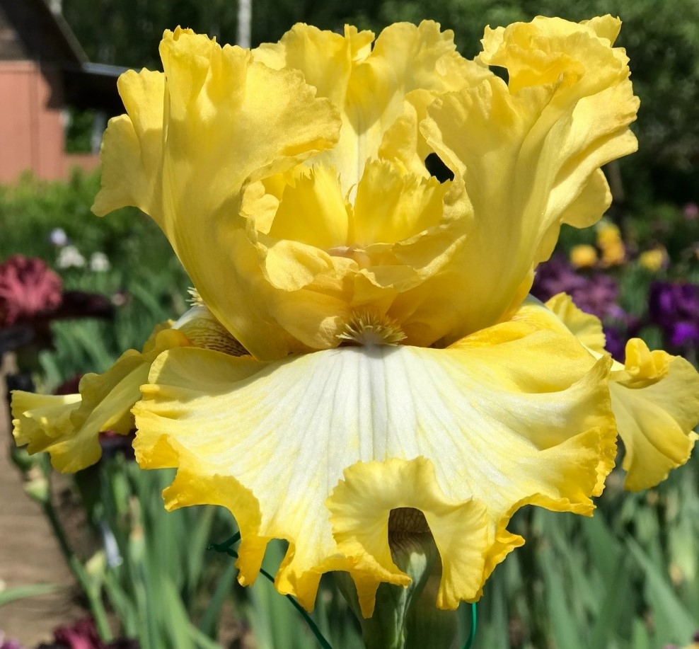 Превосходный ирис с лимонными стандартами, фолы кремово-белые с гофрированной лимонной каймой. Высота цветоноса: 91 см.